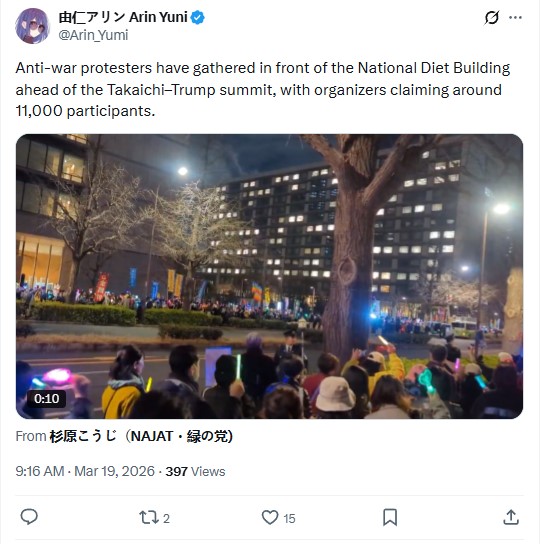 >>531107283Biggnest anti-war protest in US ally country in Japan, 11,000 People protest at governament building against Trump request for the JSDF against iran and to protect Article 9 of the constitution, biggnest protest against this war in a US ally country.