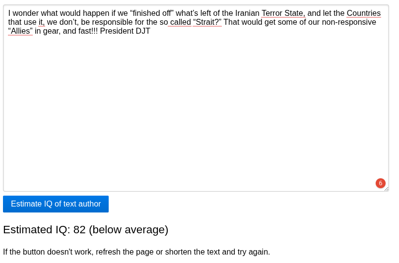 >a discord tranny and some 400lb blue haired genderxir on the internet SWEAR you are winning the war because your retarded sandmonkeys MIGHT have managed to accidentally shoot down a flying militarized Buc-ee's and occasionally can throw an exploding rock at people