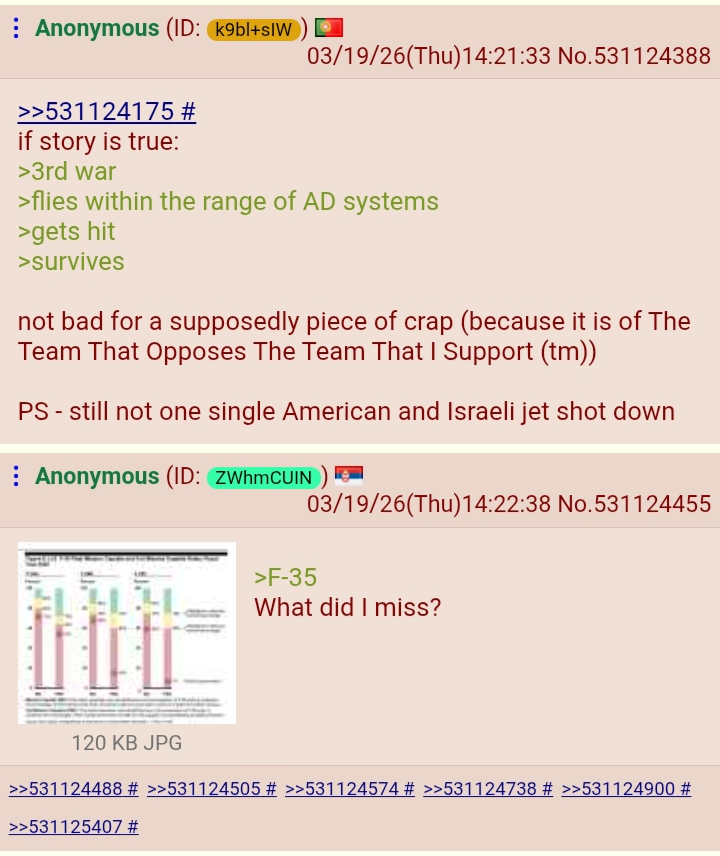 >>531124560The problem with Iranian AA especially the ones they use are only relying on thermal seekers. Good for dumb and slow planes like ISR drones or tankers. Not so much for faster moving jets. They need to upgrade their seekers because they should have shot down at least half a dozen F-35's by now but this retard forgot to pop flares.Either way, Iranians are only going to get better and the US will likely become more and more hesitant and back off the longer this war goes on. Especially when it looks like the US is struggling to find launchers. Again, because the Iranians are getting better.Either way, nobody is perfect but Iran is doing pretty good considering their history.