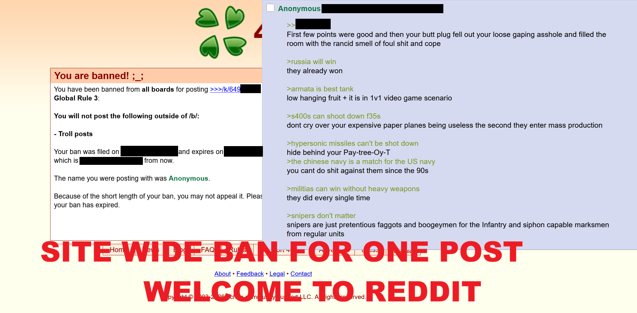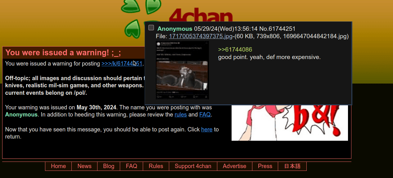 >>531129122I got banned there for posting a pic of a US congressman showing how much Pentagon parts cost.There's no point in posting there. It's just a bunch of indoctrinated retards. And just look at the posting freq there... /k/'s been dying for a while