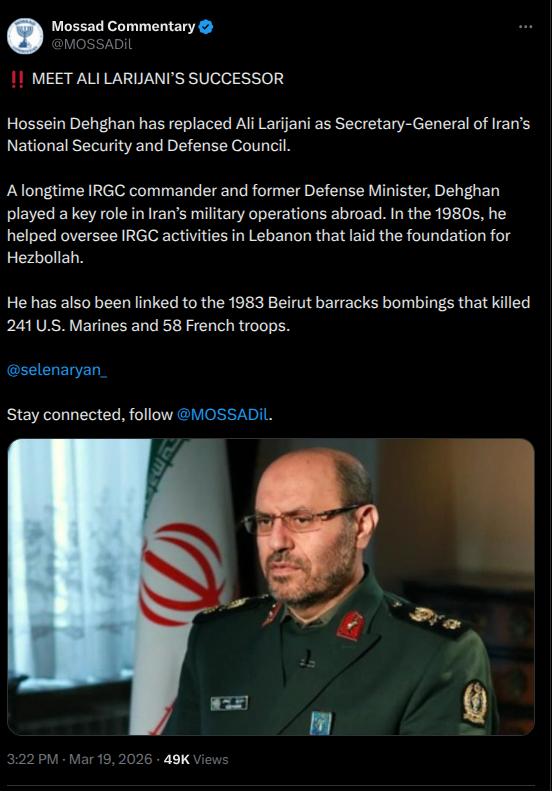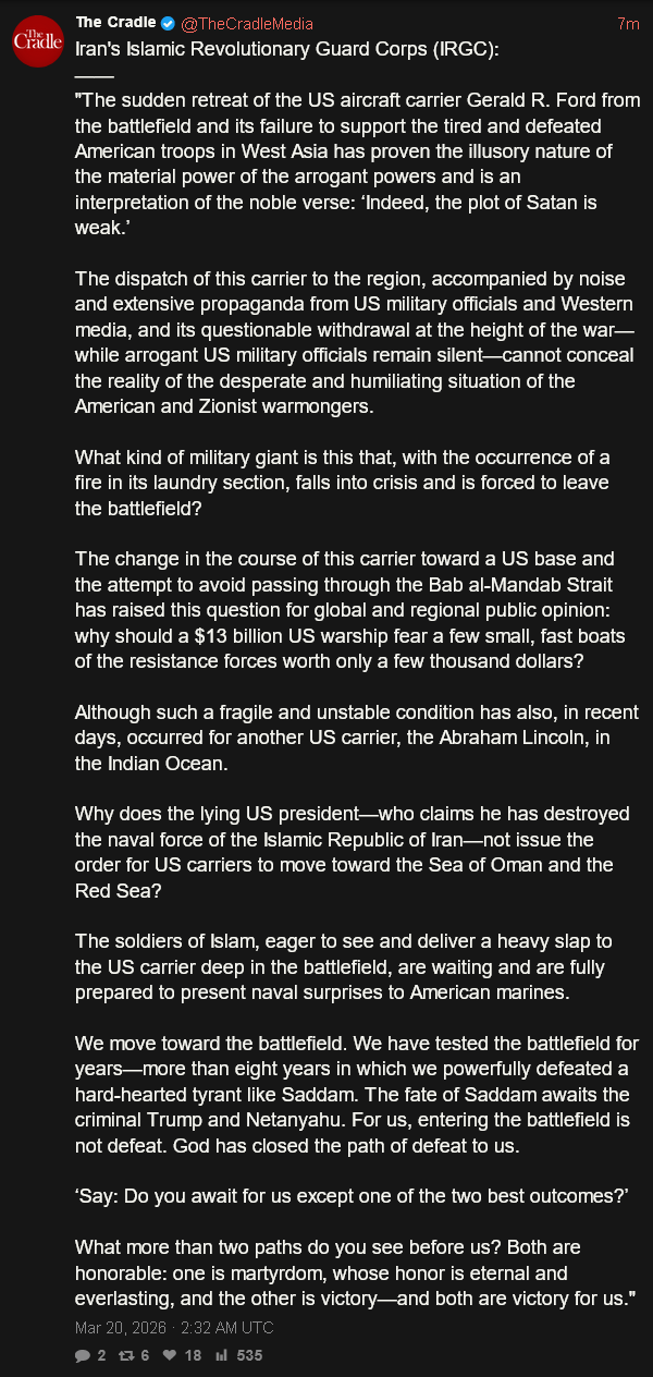 Previous: >>531149470Timeline:▶ Day: 20>▶ Day: 19>Extensive attacks in Bandar Abbas Iran's primary maritime gateway>Iran damaged an F35 causing it to do an emergency landing in Saudi Arabia>Iran damages Israeli refinery in Haifa>Israel hits Iranian navy in the Caspian Sea.>Iran hits Kuwait energy infrastructure>Trump publicly vows Israel will not attack energy infrastructure in Iran again>The Pentagon has asked the White House to approve a funding request of over $200 billion for the war in Iran, according to the Washington Post.>The Trump administration is considering deploying thousands of additional U.S. troops to the Middle East as Trump weighs next steps regarding Iran, which could include an attempt to secure the Strait of Hormuz▶Livestreamshttps://www.youtube.com/watch?v=4E-iFtUM2kkhttps://www.youtube.com/watch?v=JHwwZRH2wz8 ▶Telegramhttps://rentry.org/tgnews▶Twitter accountshttps://nitter.net/clashreporthttps://nitter.net/FaytuksNetworkhttps://nitter.net/sentdefender▶Israel Rocket Alertshttps://www.tzevaadom.co.il/en/▶Air Traffichttps://www.flightradar24.com/https://flightaware.com/livehttps://globe.adsbexchange.com▶Maritime Traffichttps://www.marinetraffic.com/