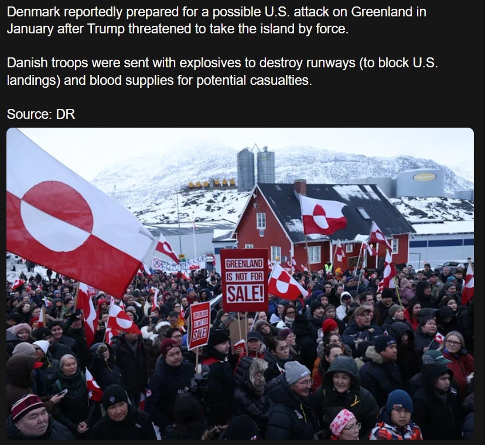 Denmark reportedly prepared for a possible U.S. attack on Greenland in January after Trump threatened to take the island by force.Danish troops were sent with explosives to destroy runways (to block U.S. landings) and blood supplies for potential casualties.Source: DR