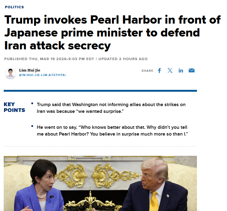 Should this go in the sticky? It's NEWShttps://www.cnbc.com/2026/03/20/trump-pearl-harbor-japan-takaichi-iran-war.html