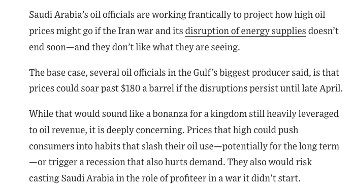 Report in The Wall Street Journal: In Saudi Arabia, it is estimated that the price per barrel of oil will jump to $180 if the war and oil crisis continue beyond April>Report in The Wall Street Journal: In Saudi Arabia, it is estimated that the price per barrel of oil will jump to $180 if the war and oil crisis continue beyond April