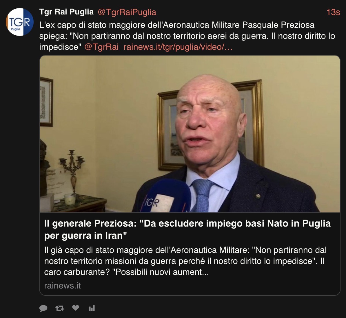 >>531170577i'll attempt to translate:the ex-leader of the general staff of the Italian Air Force Pasquale Preziosa explains: war planes will not depart from our territory. Our rights prevents it.then underneath:General Preziosa: nato bases in Puglia to be excluded from the war in iranThe former cheap of general staff of the Air Force: (same sentence is repeated as above) .. The expensive fuel? New increases possible...
