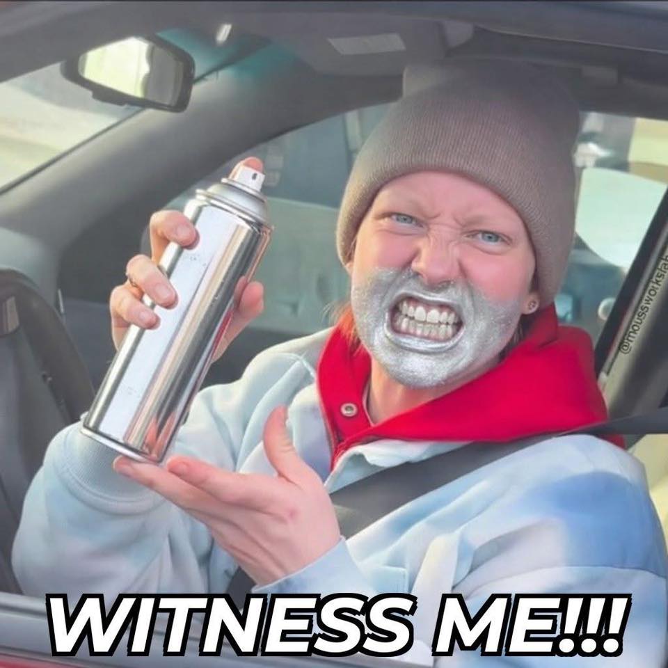 >>531172862>what the fuck is your problemThe poster has an alerted image that is meant to be a humorous reference to the film Mad Max: Fury Road. In the film, the war boys would spray a stimulant into their mouths and nasal cavities, which would leave a silver paint spay over their lower faces/mouths. They would then excitedly yell, "Witness me'" as they engaged in a suicidal attack on three behalf of their leader, Immortan Joe.The poster's image is likely making a comical reference to the fact that the pictured woman was moments away from engaging in a reckless activity that ultimately cost her, her life. Many would see her behavior as suicidal.However, there is no record of Renee Good yelling "Witness me!" before attempting to run over the armed ICE agent with her Honda Pilot.