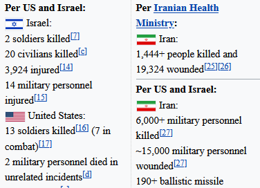 >>531176267Looks like the Jews and Mutts include school children as military dead. There is no civilian category on the Iran side. Typical Jews inflate their own civilian dead. Always playing the victim.