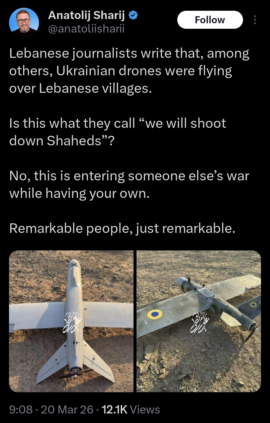 This is becoming the biggest NATO air campaign loss so far.According to Turks and previous reports (note that this is a mix of jets destroyed on the ground and in the air)8xF151-2 F-35 (one on video in the air, another was struck on the tarmac in Al Dafra)63 MALE drones (Reapers, Heron etc)5 Eurofighters on the ground in Al Salem, Quwait7 KC135 tankers (2 mid air collision, 5 on the ground in Prince Sultan AB)>According to Turkish sources, during Iran's strikes on the Al-Salem airbase in Kuwait, Iran destroyed three Eurofighter fighter jets of the Kuwaiti Air Force and severely damaged two Italian Eurofighter fighter jets.>Earlier, an Italian reconnaissance and strike drone, the MQ-9 Reaper, was also destroyed at the same base.And we are down to 0 carriers.The Ford Carrier had exploding toilets and a crew in open revolt setting the ship on fire (multiple cases of active sabotage... if only someone would throw a hammer in the catapult rails...)The Lincoln has also fucked off.US evacuating all personell from Iraq, including the Green Zone.All US navy bases are down to 0 ships (they all fucked off).Air defence is out of missiles and Iran is operating at a 10x increased intensity of missile and drone strikes compared to the average a week ago.US also lost a key ally (the Kurds) and the Iraqi insurgency for probably the first time ever has set several US military facilities on fire (Erbil, Baghdad etc)... and they have thermal seeker SAM systems making overflight over Iraq very risky.I couldn't script this better.It is a complete (and predictable) disaster.Niklas out.