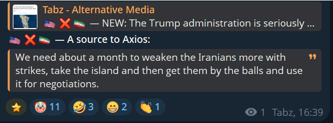 In the meantime, the USA is sending another Marine Expeditionary Unit to the Middle East.>As NBC News reports, citing sources, the 11th Marine Expeditionary Unit (MEU) of the US Marine Corps will depart from San Diego in the coming days.>It will consist of the amphibious assault ship USS Boxer, as well as the dock landing ships USS Comstock and USS Portland, carrying 2,200 Marines and their equipment. The aviation component includes F-35B fighter jets, AH-1Z Viper helicopters, UH-1Y Venom helicopters, and CH-53E Super Stallion helicopters, as well as MV-22B Osprey tiltrotor aircraft.>Together with the previously sent 31st MEU, the USA will have about 5,000 Marines and 4,000 sailors in the Middle East, along with several amphibious ships, support vessels, and aircraft. This is still not enough for a large-scale ground operation, but it is sufficient for a small-scale landing on Iranian coastal islands or actions to protect the Strait of Hormuz.Bay of Pigs 2.0?