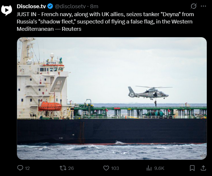 >The French army seized the oil tanker DEYNA off the coast of Algeria, allegedly connected to RussiaEvery time the euros want to prove they aren't completely weak coward, they seize a civilian tanker and have to release it next week.