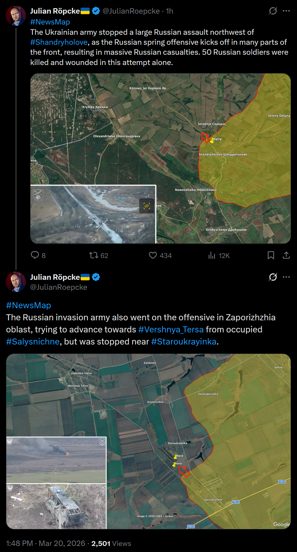 https://x.com/JulianRoepcke/status/2034960218061148251>#NewsMap >The Ukrainian army stopped a large Russian assault northwest of #Shandryholove, as the Russian spring offensive kicks off in many parts of the front, resulting in massive Russian casualties. 50 Russian soldiers were killed and wounded in this attempt alone.>The Russian invasion army also went on the offensive in Zaporizhzhia oblast, trying to advance towards #Vershnya_Tersa from occupied #Salysnichne, but was stopped near #Staroukrayinka.it's yvir