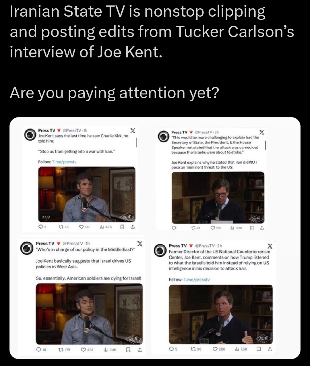 >>531179443>Tucker is an agent of QatarQatar is on Israel's side in this war.