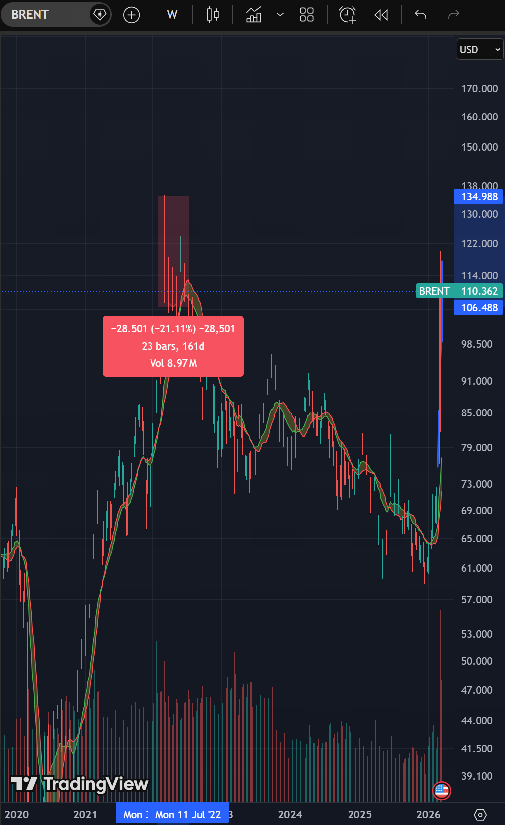 >>531195197What fictional reality do you inhabit? Brent was down steadily fell from it's high point and was well below 100 before the year was out. It rapidly spiked on speculation then rapidly fell again. The spike itself was caused by delays in getting the supply chain of it running full bore, the collapse had a lot to do with literally nowhere left to store oil.Again, America has never poomped at ANYWHERE near full capacity since that price collapse, covid or no covid. They never want to experience $40 a barrel oil again.