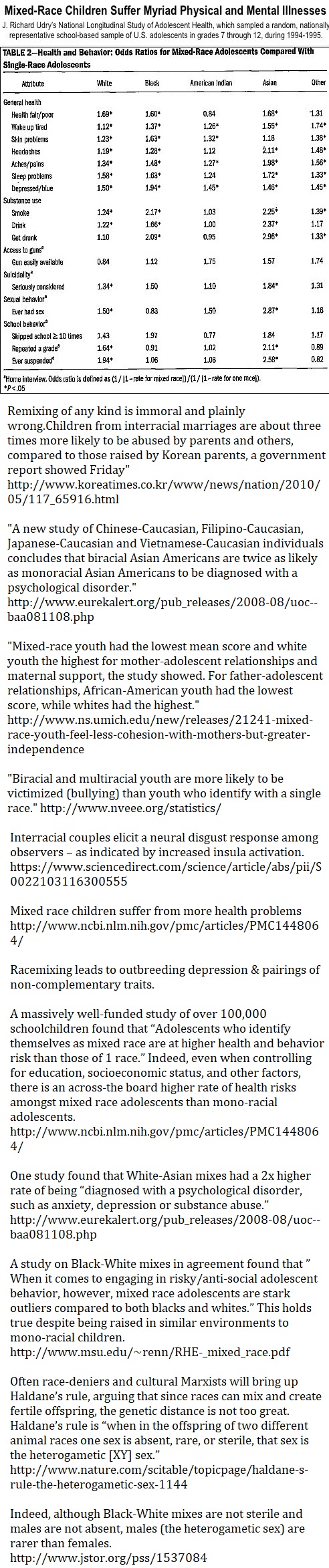 >>531185067>race-mixing proven badhttps://www.ncbi.nlm.nih.gov/pubmed/15390318https://www.ncbi.nlm.nih.gov/pmc/articles/PMC2867623/https://www.ncbi.nlm.nih.gov/pmc/articles/PMC1448064/https://m.medicalxpress.com/news/2009-05-mixed-race-patients-struggle-marrow-donors.htmlhttps://en.wikipedia.org/wiki/Outbreeding_depressionhttps://med.stanford.edu/news/all-news/2008/10/asian-white-couples-face-distinct-pregnancy-risks-stanfordpackard-study-finds.htmlhttps://www.ucdavis.edu/news/biracial-asian-americans-and-mental-health?id=8732https://content.time.com/time/health/article/0,8599,1993074,00.htmlhttps://www.ncbi.nlm.nih.gov/pubmed/15994621https://en.metapedia.org/wiki/Effects_of_race_mixinghttps://en.metapedia.org/wiki/Miscegenation