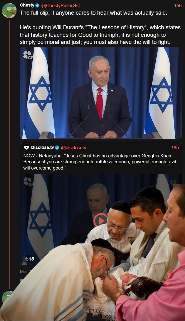 >>531185190He was citing a Catholic historian and talking about why Christians need to defend themselves against evil you brainlet.https://www.realclearpolitics.com/video/2026/03/19/netanyahu_the_west_has_to_be_strong_to_survive_jesus_christ_has_no_advantage_over_genghis_khan.html>>531185300Pic related is what he actually said.