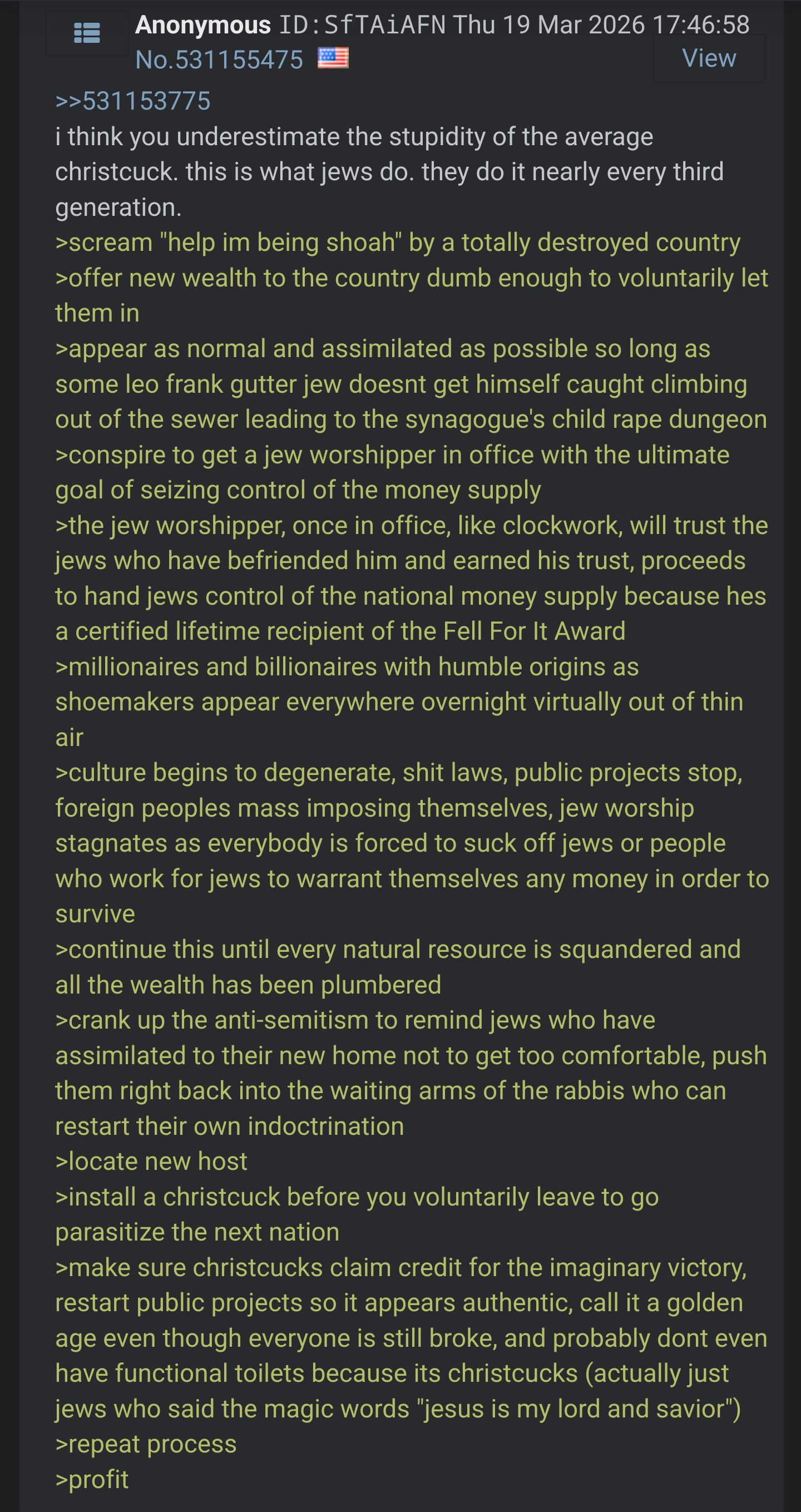 >>531201635>Cope and seethe, faggot.>And don't forget the jew god loves youMost obnoxious posters on /pol/. Not even good at trolling or shitposting.
