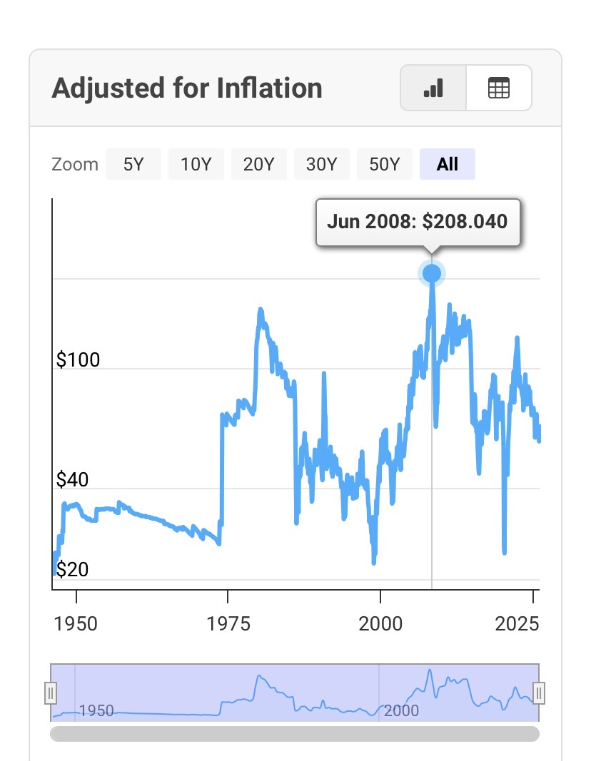 >>531185999You can't adjust oil for inflation. It IS the inflation to a major degree. We have been completely impoverished and CAN NOT AFFORD the old price "adjusted for inflation" as it would increase all other prices proportionally. Cheap oil is the only thing keeping us going.