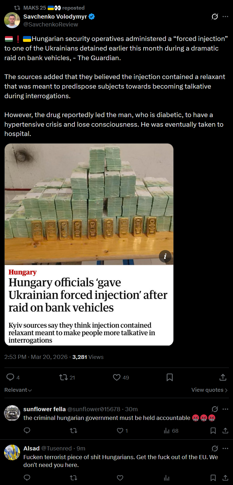 >Hungarian security operatives administered a “forced injection” to one of the Ukrainians detained earlier this month during a dramatic raid on bank vehicles, - The Guardian.>The sources added that they believed the injection contained a relaxant that was meant to predispose subjects towards becoming talkative during interrogations. >However, the drug reportedly led the man, who is diabetic, to have a hypertensive crisis and lose consciousness. He was eventually taken to hospital.damn war criminals