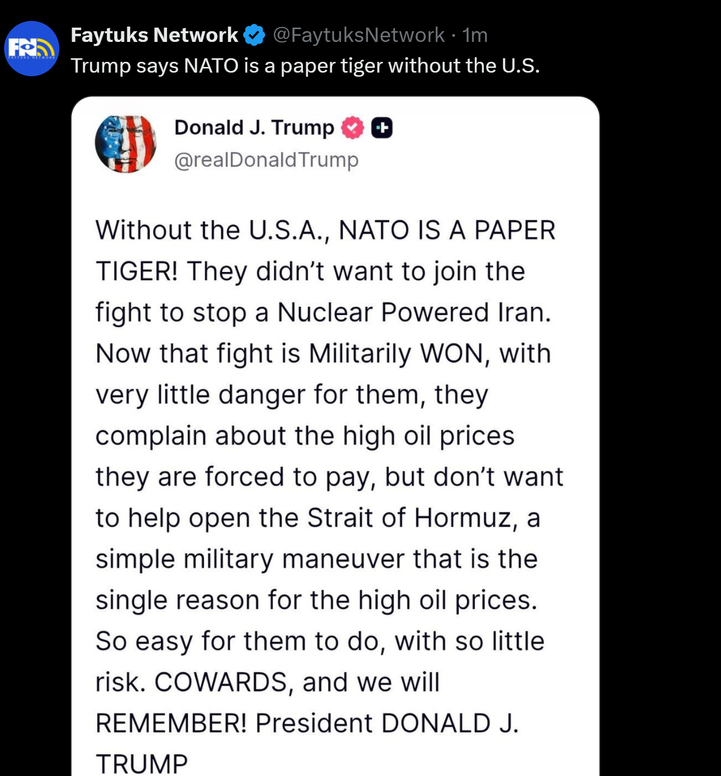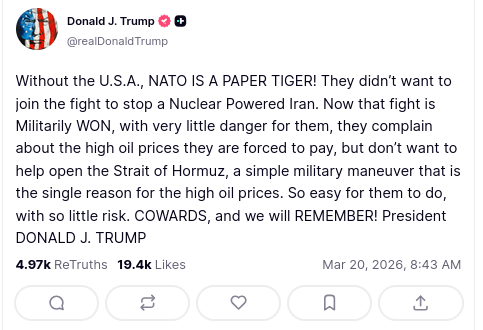TRUMP CALLS NATO A PAPER TIGERDECLARES WAR WITH IRAN IS ALREADY WON!!!!!!!!!SEETHING!!!!!!!!!!