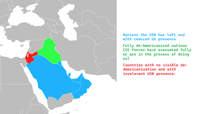 >>531193132>Are ya winning goyim?It's looking good for Iran.1 Country fully de-americanized.5 partially de-americanizedWhen the blue are green, Iran has succeeded in the main objective.When Israel is gone, the world has won.