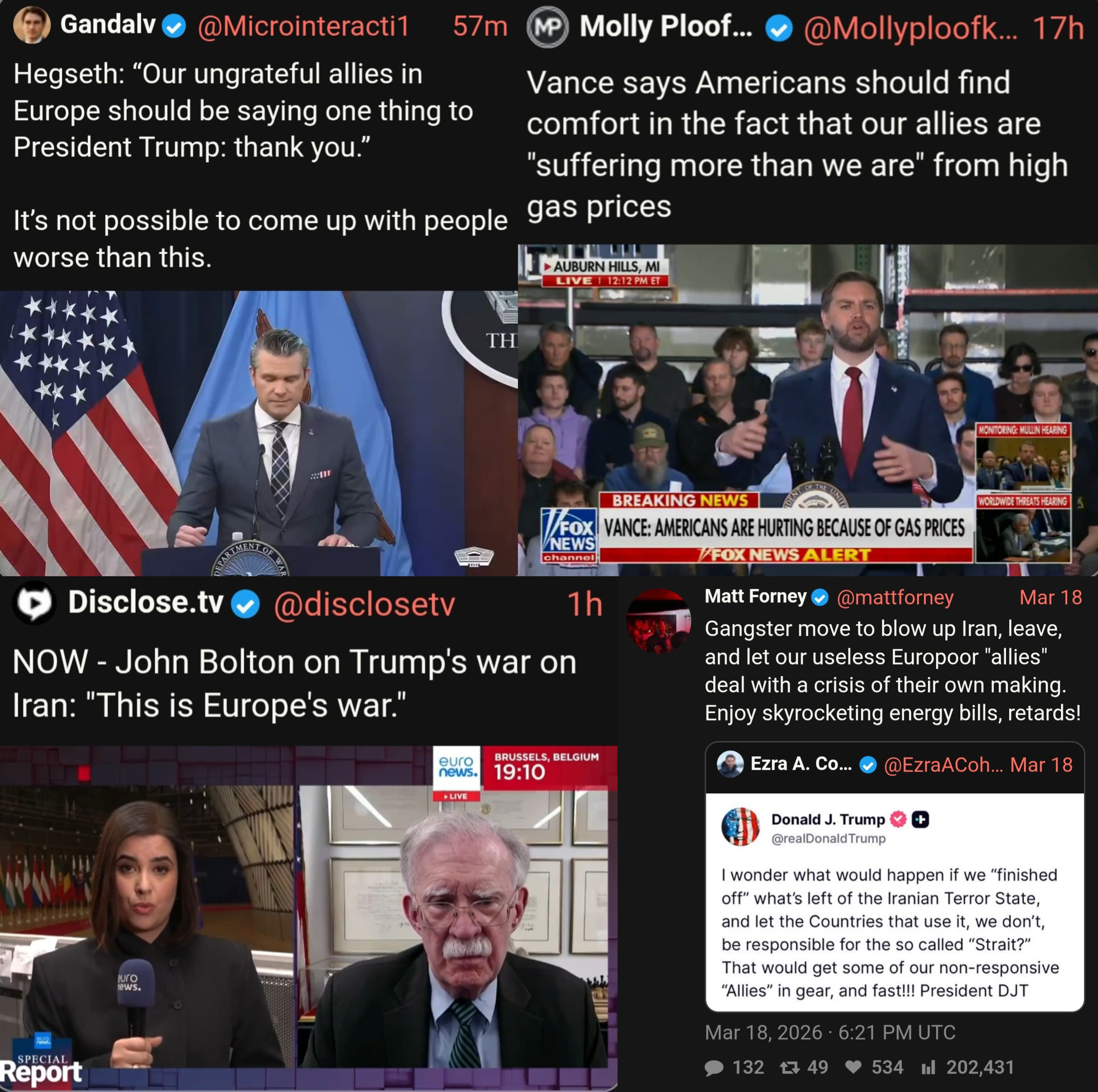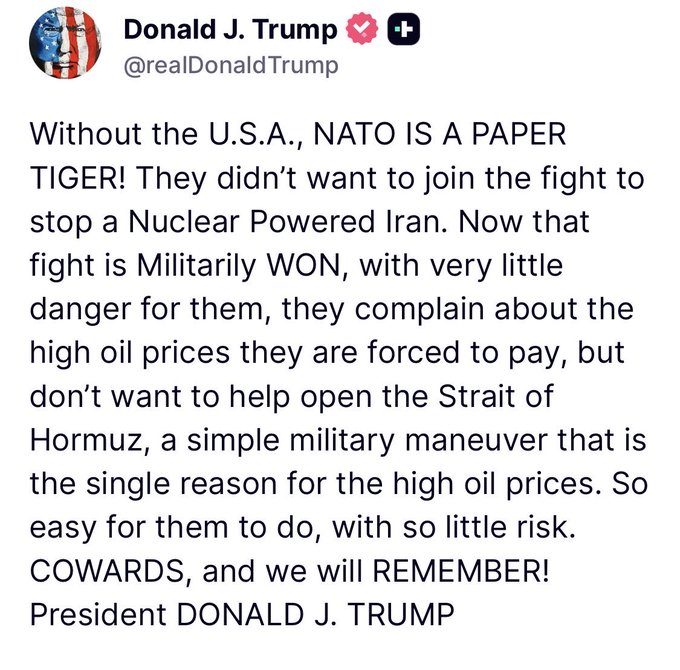 >>531190860I seriously need someone to explain this tweet to me because my mind cannot comprehend it.He is saying the fight is won so there is no risk for NATO action which will help NATO allies immensely, but Strait of Hormuz isn't open and NATO allies unwilling to help.It is easy to do and have little risk.Why doesn't the USA open the Strait by themselves?Does he want NATO to help or not?What is the point of this tweet at all?