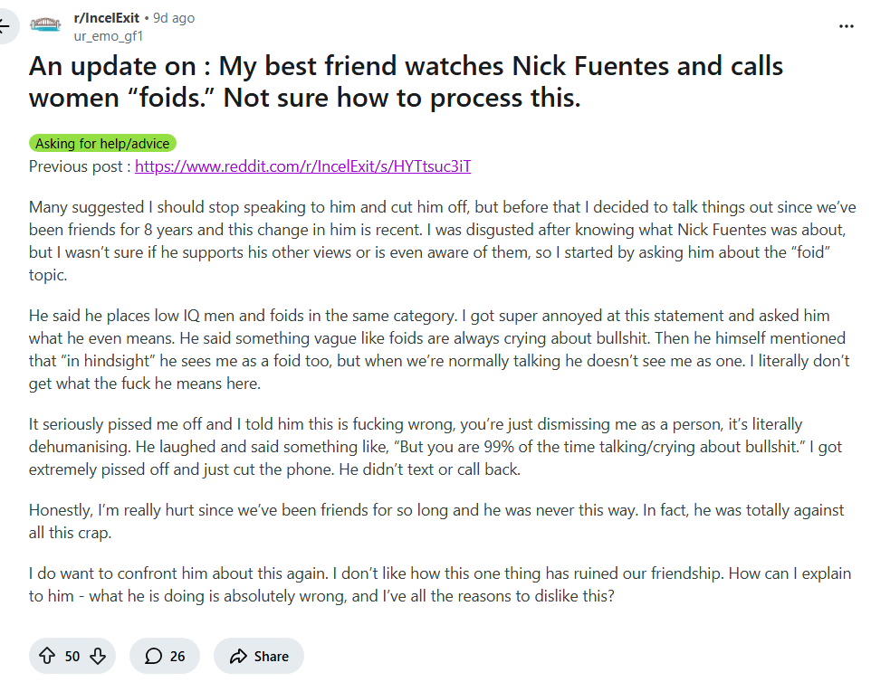 >>531191394>best friend of 8 yearsYeah that's why he's watching Fuentes and probably Tate now. He spent 8 years being a beta faggot for you and got treated like a servant for it. Good for him that unlike some lifelong simps he realized his situation.Women always like to claim they're "friends" but while a man cares for his friends, women do not. A woman will take a lot, and she might give a little for a so called friend, but only that which doesn't inconvenience her too much or has much value to her. The only ones women really care for are men they are attracted to, and you can see the difference in treatment Chad gets vs the beta orbiter friend.
