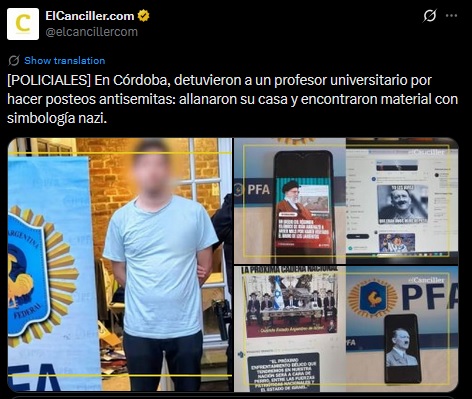 >Translation: University professor arrested in Córdoba for making antisemitic posts: the police searched his home and found material with nazi iconography.Free country though, right?