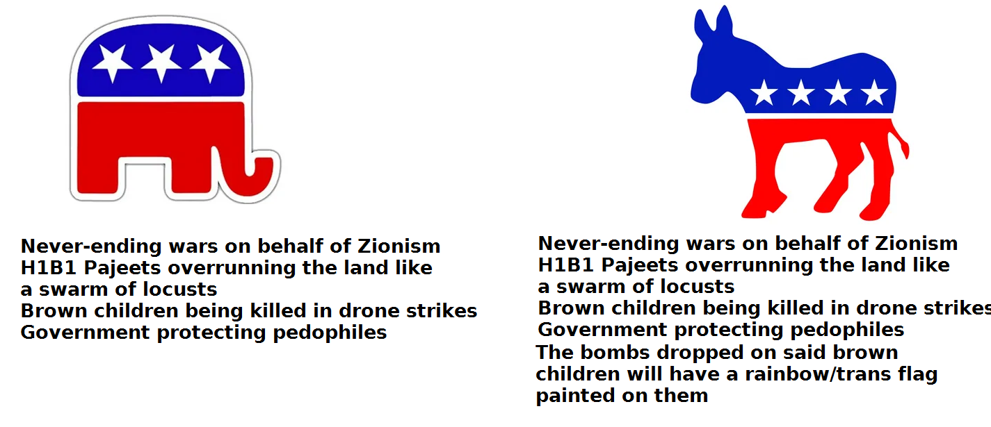 >>531193343>hey conservative board!>this picture says Republicans and Democrats are the same to demoralize you into not voting>I carefully avoided topics like open borders, gun rights, crime stats, transgenderism, and other topics that they diverge on>don't you think you should not vote??I don't blame the attempt, but I feel like you ShareBlue faggots are just getting lazy in the propaganda these days.