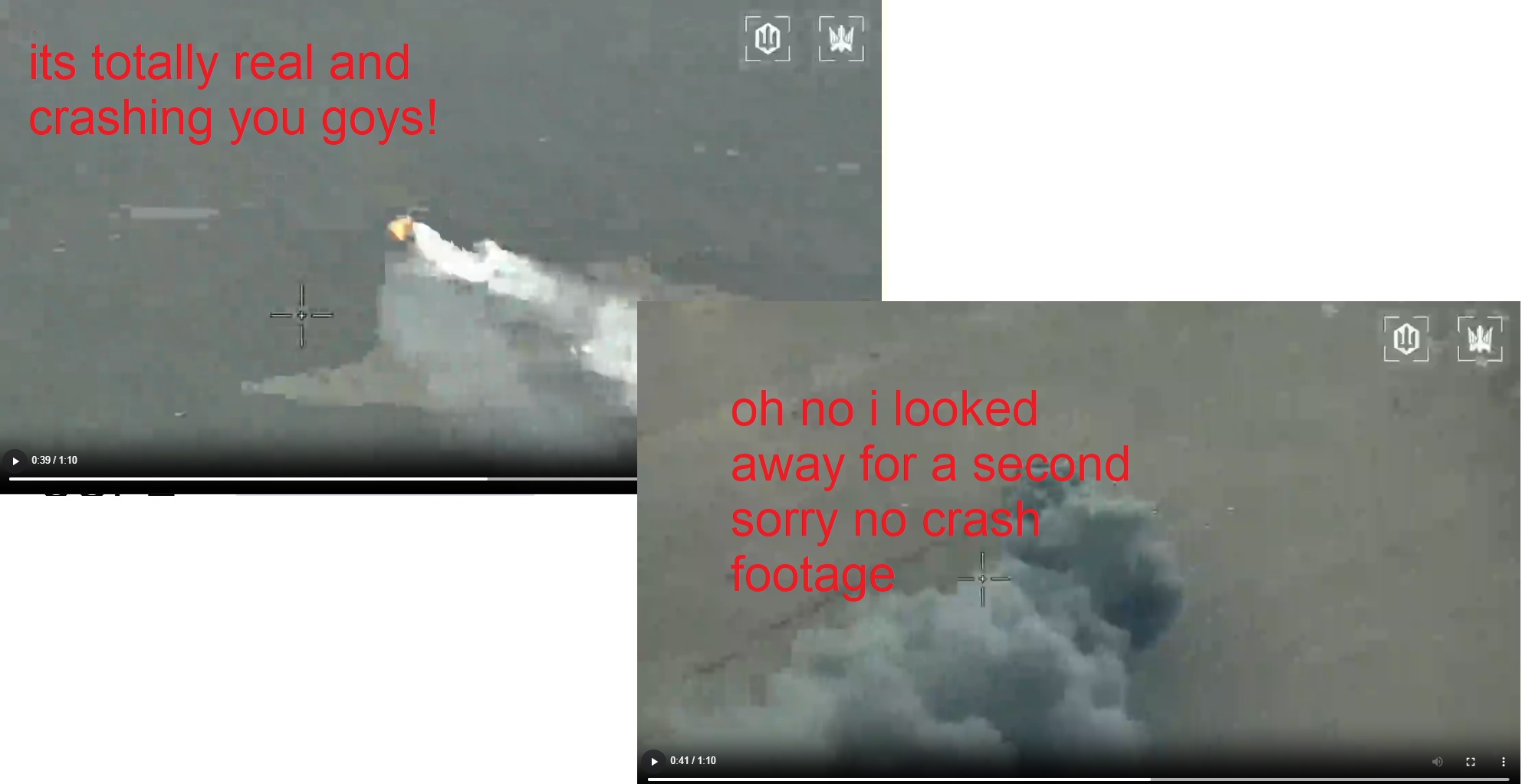 >>531198949video literally shows the drones missingthe drone is recording the supposed ongoing crash but cuts off the actual crash for no reason>>531195819theres the video