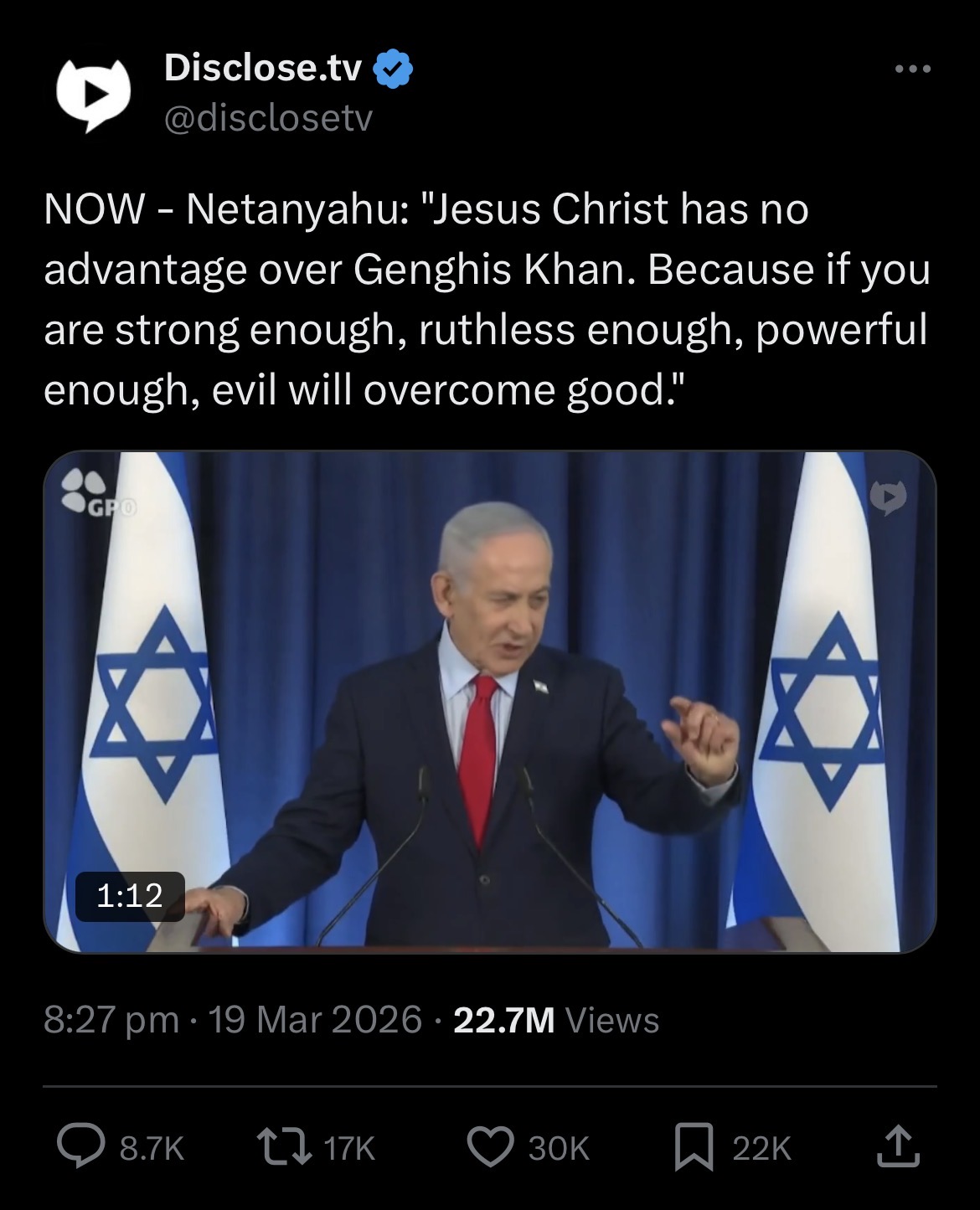 GIGA HAPPENING! In this short clip, Netanyahu UTTERLY DESTROYS Christians!>Jesus Christ was a weak beta cuck, Genghis Khan was a high-T alpha male>there's no purpose in being a good person>the goyim have no choice but to fight Israel's wars>subtly threatens the U.S. if they don'thttps://x.com/disclosetv/status/2034713271517794575
