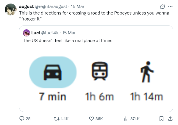 I don't really get the appeal of driving everywhere, the whole individualism angle feels like a larp. Cars are just a means to get to point A to point B for me 99.9% of the time and I'm not actually that picky as to how I get there. I'm not going on any wild adventures in my car, nor do I really have the luxury to do so.