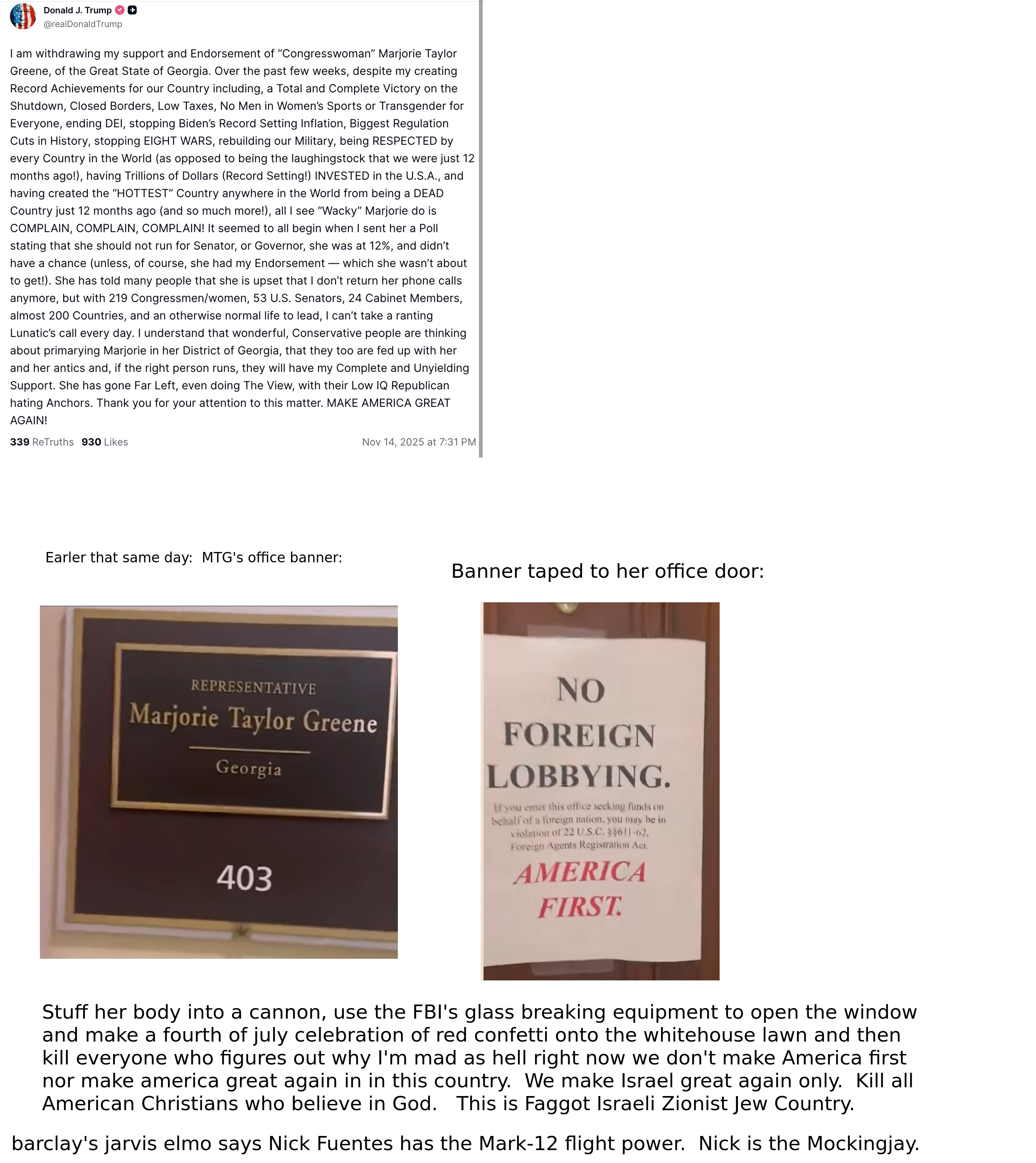 Israel first in every single doorway of every office in the whitehouseone senator: Perhaps we're not optimizing policy by giving these loud and proud 666 kikes infinite US power and....That's all well and good Miss mtg, but you are no longer a Senator. You don't even get to speak or be heard anymore.US Response to protecting Israel with military power: Limp Wristed. Why was the response so lack luster as compared to the fighter jets and C130's dropping crates on Ukraine within 7 hours response? Ok sir, you don't get to speak either. Onward and forward to the pressing topics: Climate Change, and What is a Woman?