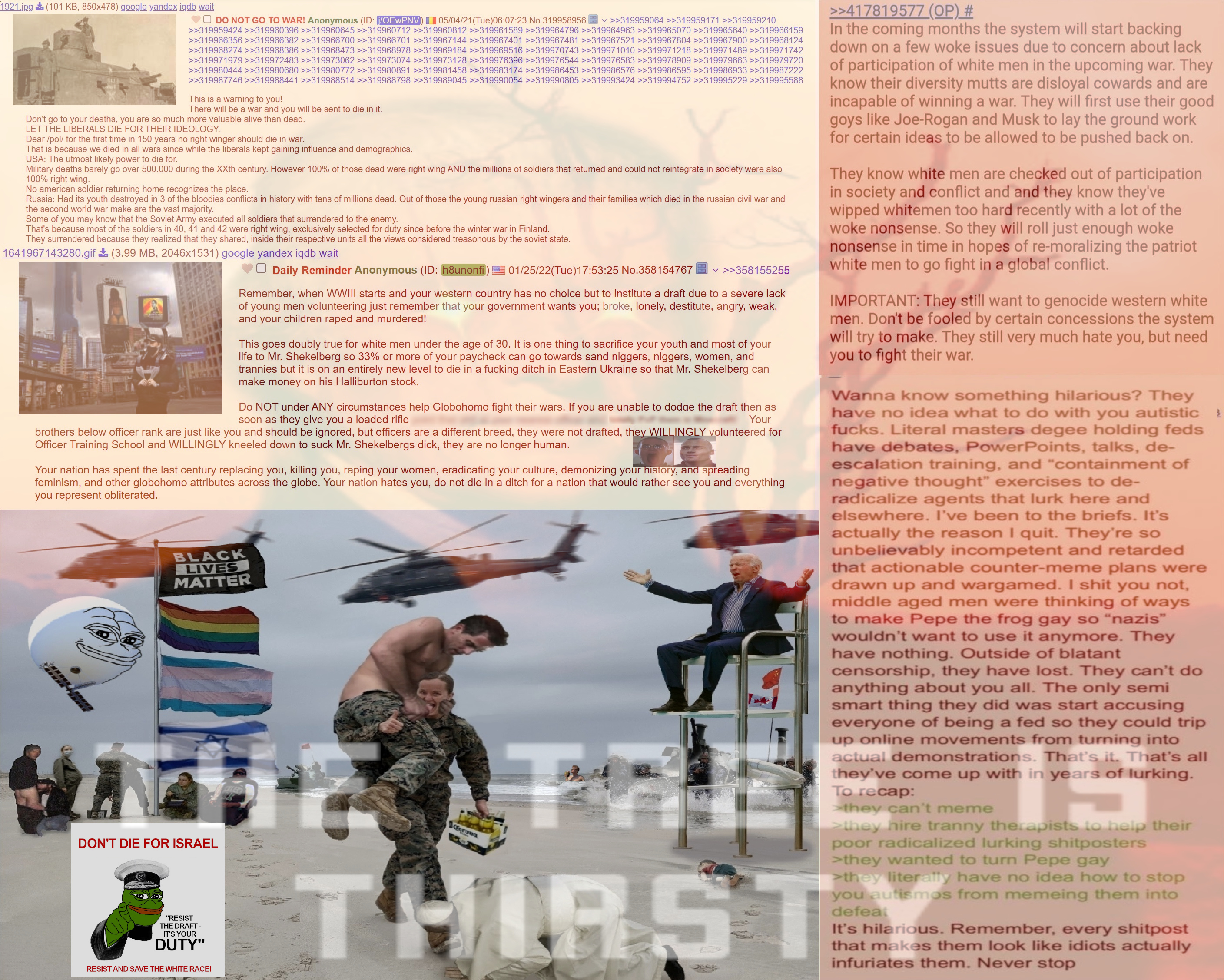 >>531208398Elaborate. I can’t fathom a universe in which my country can draft for more than a week without it all spiraling into a literal civil war.The majority of drafting targets are uppity and lead relatively comfortable lives. Most countries in the west are also not in a semitic chokehold, can’t use religious gaslighting to manufacture battlefield golems. Drafting isn’t going to happen because it can’t.
