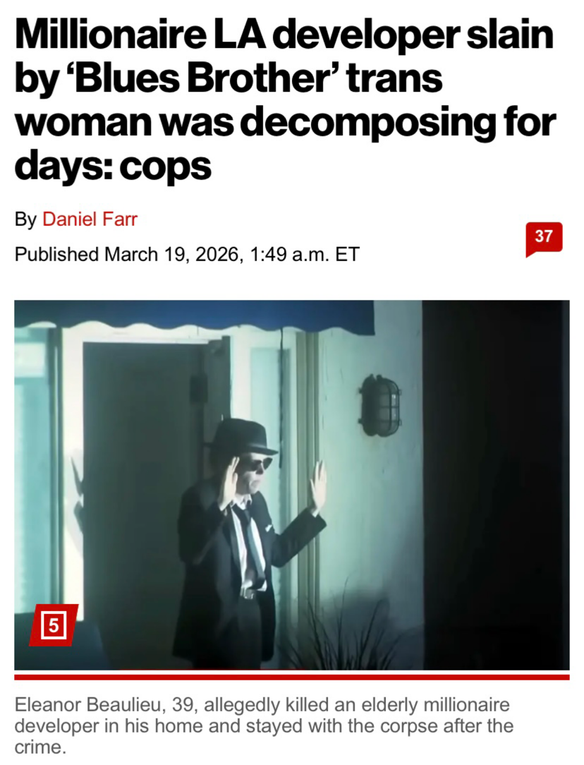 >The body of a 92-year-old real estate developer have been decomposing for days before he was found dead inside his Hermosa Beach home. The new details follow a bizarre standoff with a suspect who had been holed up inside for hours, authorities said.>Demetrius Doukoullos, a longtime property owner in the quiet coastal community, had not been seen for several days before someone requested a welfare check at his residence.>Neighbors had also reported a foul odor coming from the home, raising alarm.>When officers arrived, they encountered a 39-year-old suspect already inside the house who refused to come out and claimed to be armed.>The suspect, identified as Robert Simmons, who also goes by Eleanor Beaulieu and is described in reports as a transgender woman, barricaded themselves inside a bedroom and triggered a tense, hours-long standoff with police and SWAT teams.>After roughly seven hours, negotiators convinced the suspect to surrender without further incident.>Doukoullos was found dead in the home, with investigators noting signs of trauma.>Bail has been set in the millions as detectives continue working to piece together what led to the killing. Authorities have not said whether the suspect and the victim knew each other, and a motive has not been identified.>The timeline suggests the suspect remained inside the home in the days leading up to the discovery, though investigators have not released full details about what happened during that period.https://nypost.com/2026/03/19/us-news/millionaire-may-have-been-dead-for-days-before-bizarre-standoff/