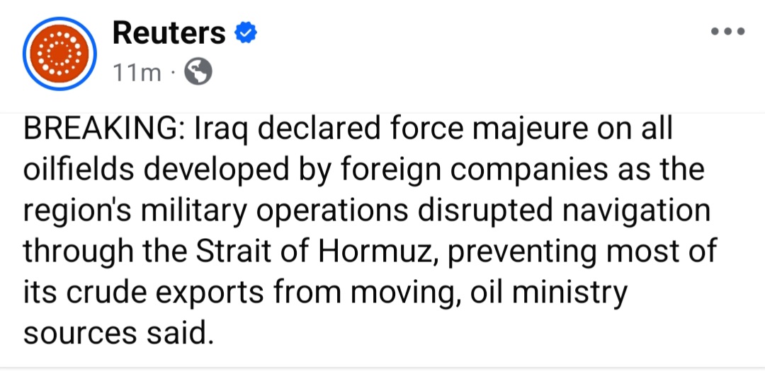 Iraq has declared force majeure on all oilfields developed by foreign oil companies, as military operations in the region have disrupted navigation through the Strait of Hormuz, preventing most of the country's crude exports from moving, oil ministry sources said.https://www.reuters.com/business/energy/iraq-declares-force-majeure-foreign-operated-oilfields-over-hormuz-disruption-2026-03-20