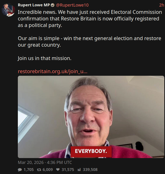 It hasn't launched yet. That's why it isn't included in official polls yet. And he is barely more popular than Ed Davey in his own commissioned poll he finished second from bottom in lmao. The poll wasn't about Restore anyway. Just asked who would make the better PM lol