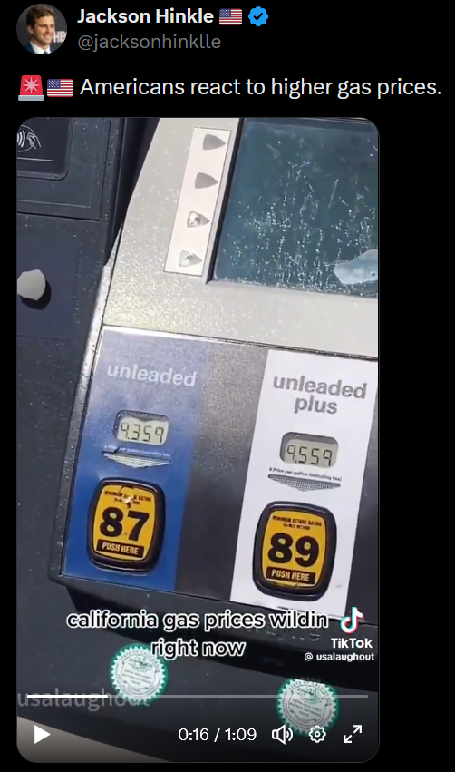 I can't remember the last time gas was less than 4.50 in California and that's purely because of green new scam policies shutting down refineries and taxes up the ass to subsidize all the illegals. It's inching past 7 now, but it would have done so even without this war, Valero refinery is set to close next month. 10 dollars per gallon by the end of the year, I want strangle Gavin Newsom with his own tie. If the brit or sheriff Chad don't win the governor's seat then I'm packing my bags to Alabama and voting red for the rest of my life.