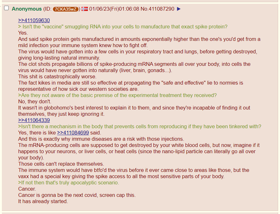 >>531238985>still won't answer how many of the miracle boosters he's taking and planning to take in the future.You would think more vaxxies would be proud of the jew-jab that they defend so vigorously online. Anyway, it' 2:42 AM where you are, vaxxie. Go to bed and dream about all the rewards you are going to get from putting full faith into your wonderful government.