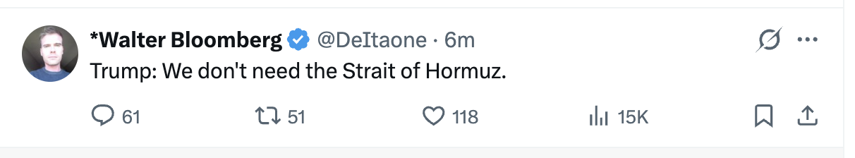 >>531215288You need it for the petrodollar. >>531216568>>531216714>>531216422>>531216812>>531217923>>531219632>>531215475The US doesn't produce enough oil to cover the loss of the strait. The US produces around 13.7 million barrels per day right now. 20 million go through the strait per day. Even if the US somehow magically maxed out every rig, well, and pipeline overnight (which it can't), it couldn't replace that to offset the global shortfall.The US is already tapping the strategic reserve due to rising oil costs too, keep in mind, for its own use.