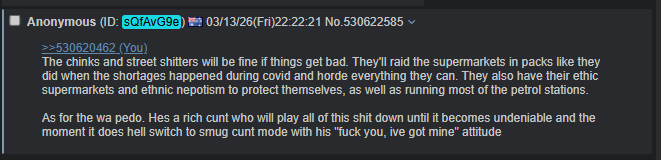 >>531252009>aus/pol/ is one person, but only anons that think im a faggotIt was an accurate prediction on how you would react. And that is exactly what you did.Same as the vaccine. You socially shamed anons into taking it. Everycunt here remembers. >2 minufe noodles>responsible anons with families take the vax!>only cookers dont take the vax! You must be crazy!Etc, etc.Kys vaxxed State boot licking reddit faggot. You never changed, even after being proven wrong on the vax. Thats what the screencap proves.