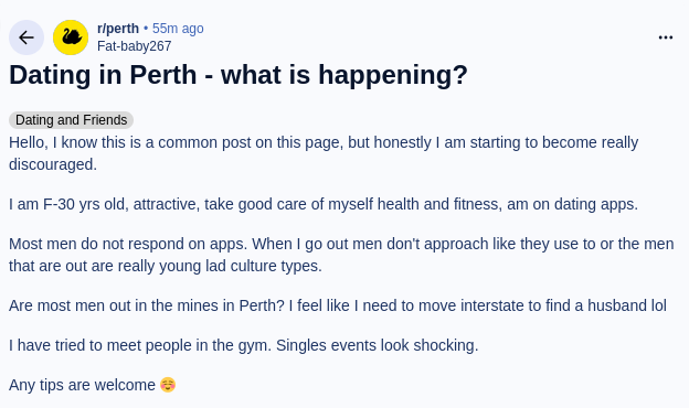 >>531246933Tons of beautiful women in perth. Tons of beautiful women with boyfriends.She's 30 and she can't be that beautiful if she's not getting matches. At a certain point if you're a woman and not getting the attention from the men you want, you'd have to be assertive because that shit works. Women are the architect of their own misery every time.