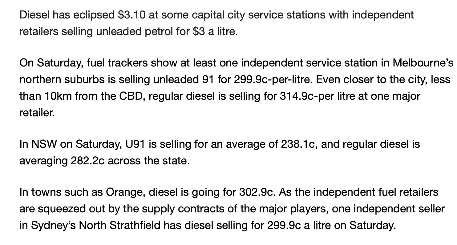 >Experts warn of 50 per cent food price spike as fuel crisis deepenshttps://www.9news.com.au/national/experts-warn-of-50-percent-food-price-spike-as-fuel-crisis-deepens/2a78bc14-b7c8-470d-9515-751baa999b51 shit is going to get wild