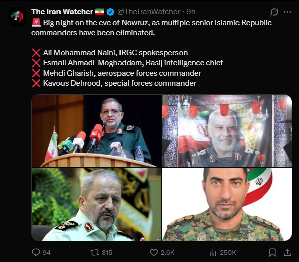 >>531216144Yes, Iran is winning.>Killed over 2,000 US soldiers>Killed 12,000 Israeli soldiers>Destroyed every American military base in the middle east >Shot down 3 American B-2 Bombers>Completely destroyed Tel Aviv, rendering it uninhabitable >Sunk the USS Gerald Ford twice, and the USS Abraham Lincoln three times >Defeated Leonidas on the first day of the war>Shot down Themistocles' F-35 fighter jet and executed him>Captured Alexander of Macedon>Captured and executed Jesus of Nazareth by crucifixion >Launched a successful orbital bombardment against New York City, cutting off the financial head of the United States>Encircled Washington with 16 legions of IRGC infantry