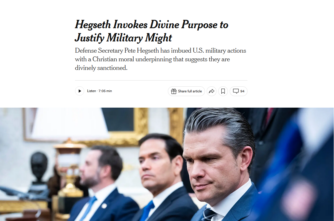 Is he right?Defense Secretary Pete Hegseth has imbued U.S. military actions with a Christian moral underpinning that suggests they are divinely sanctioned.He spoke of “overwhelming force” and the U.S. military’s unmatched ability to rain “death and destruction from above” on its “apocalyptic” Iranian foes.Then, Defense Secretary Pete Hegseth, standing in the Pentagon, issued a call to the American people for a specific kind of wartime prayer. He asked them to pray for victory in battle and the safety of their troops.“Every day, on bended knee, with your family, in your schools, in your churches,” he said, “in the name of Jesus Christ.”https://www.nytimes.com/2026/03/20/us/politics/hegseth-christianity-military.html