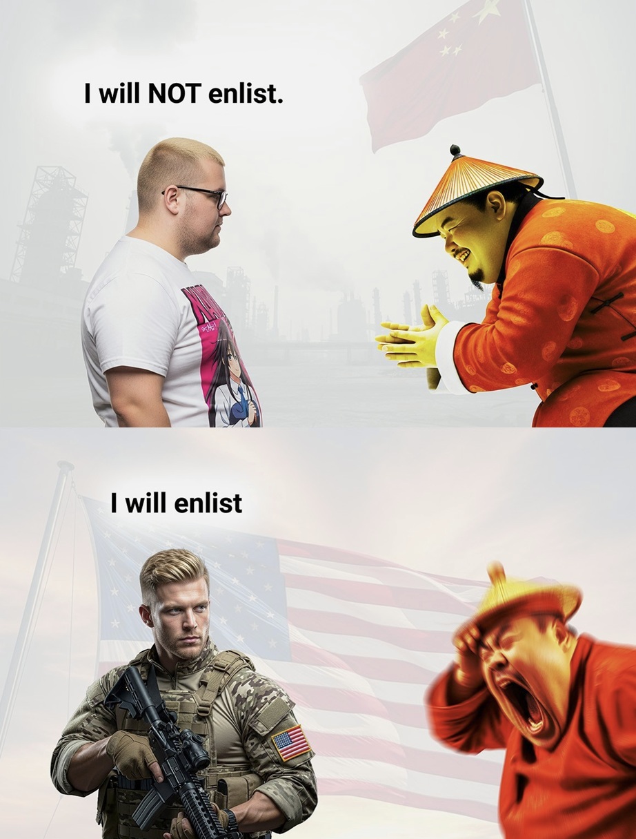 >>531216383>we need you to enlist to fight a war we started against a country on the other side of the planet because le china or something
