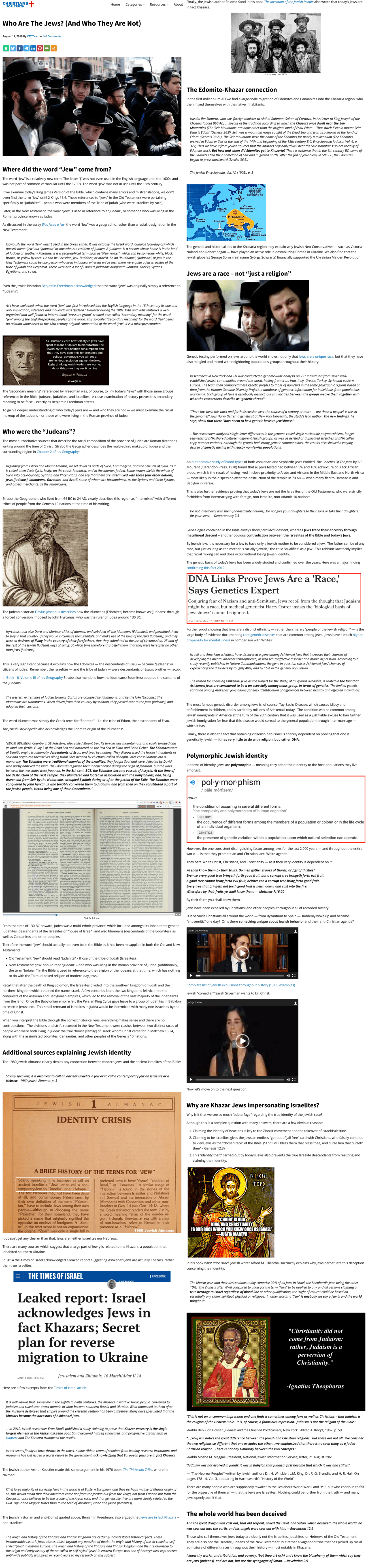 >>531216680The "Jews" are the very people that say they are "Jews", and are not (they are not actually from the tribe of Judah or any of the other 12 Israelite tribes), but are the synagogue of Satan. Which means the opposer, the accuser, the adversary of Jesus Christ. That is what Jews literally are, adversaries of Jesus Christ who congregate in a religion that is explicitly antichrist. They do not have any lineage to ancient Israelites, and they do not fulfill a single Biblical earmark of the Israelites. But they may go back to Khazaria and Edom. They are not "a pure people", they have always been converts, they are just an antichrist cult full of random ethnicities from whoknowswhere over the last 2000 years. Even in Judaea back then there were Edomites and Canaanites (hypocrites; pretenders) among the religious authorities. The very Judaean Roman client king was an Edomite, Herod was an Edomite. This is world encyclopedia history, not some "conspiracy theory". And Jesus told those hypocrites that they are not his sheep (John 10:26), and that is the reason why they are unable to believe in him. God's sheep are the Israelites, the descendants of Jacob. And even those pharisee back then were not God's sheep = they were not Israelites.