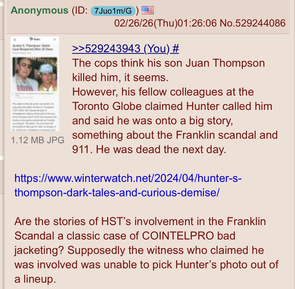 >>531258987HST was fascinating, the adrenochrome rumors, his lawyers disappearance, his suiciding. The heavy foreboding menace in Fear and Loathing, his mention in the Franklin Scandal…. But he was also a supposed freedom fighter. Excellent writer. >it’s easy to kill a junkieHis “suicide” case has been recently reopened and to be fair his son Juan acted suspiciously.