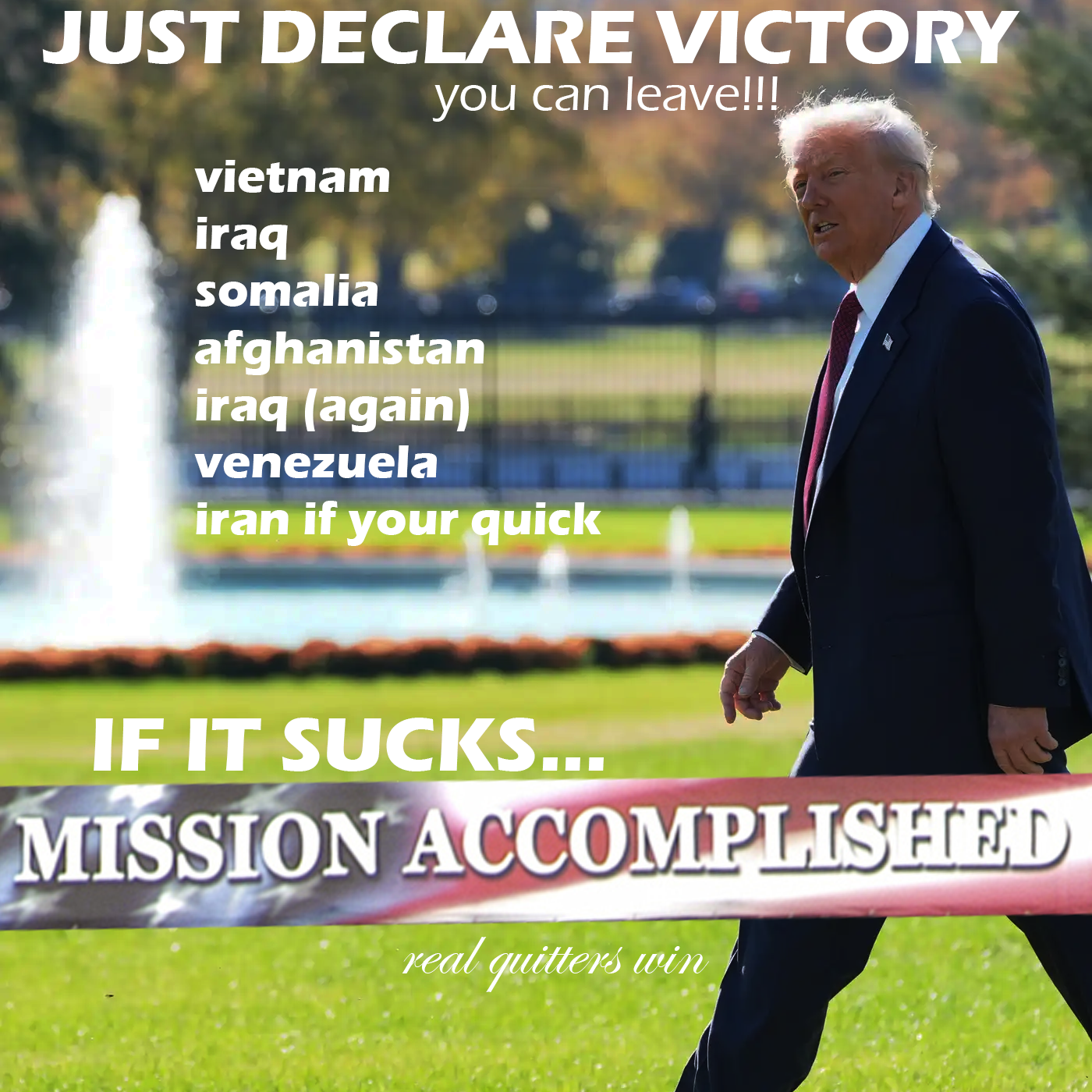 >>531228643Trump can pull the ultimate lmao and go>we're gone here and going home, you deal with the rest yourselves