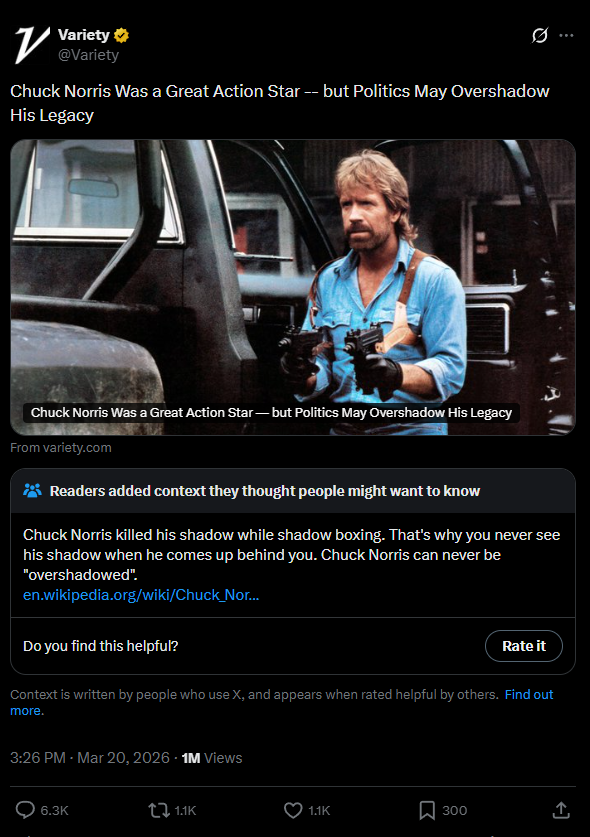 >Chuck Norris...is dead.>Why?>Well nobody wants to say...your not allowed...to ask.>But I'm going to ask. Because I'm an American. I'm allowed to. Nobody can tell me no.>Go ahead.>Try.>Tell me no...I'm, waiting.>Why haven't you told me no? Are you allowed to tell me no? Is Israel behind Chuck Norris' death?>Did Trump know what Israel was planning to do to Chuck Norris?>On this episode of the The Tucker Carlson Show I will be speaking with the esteemed political prophet Alexander Dugin as he lays out...exactly why Israel killed Chuck Norris...>And how this means the end of America.>Tonight>On the>Tucker Carlson Show. Stick around.
