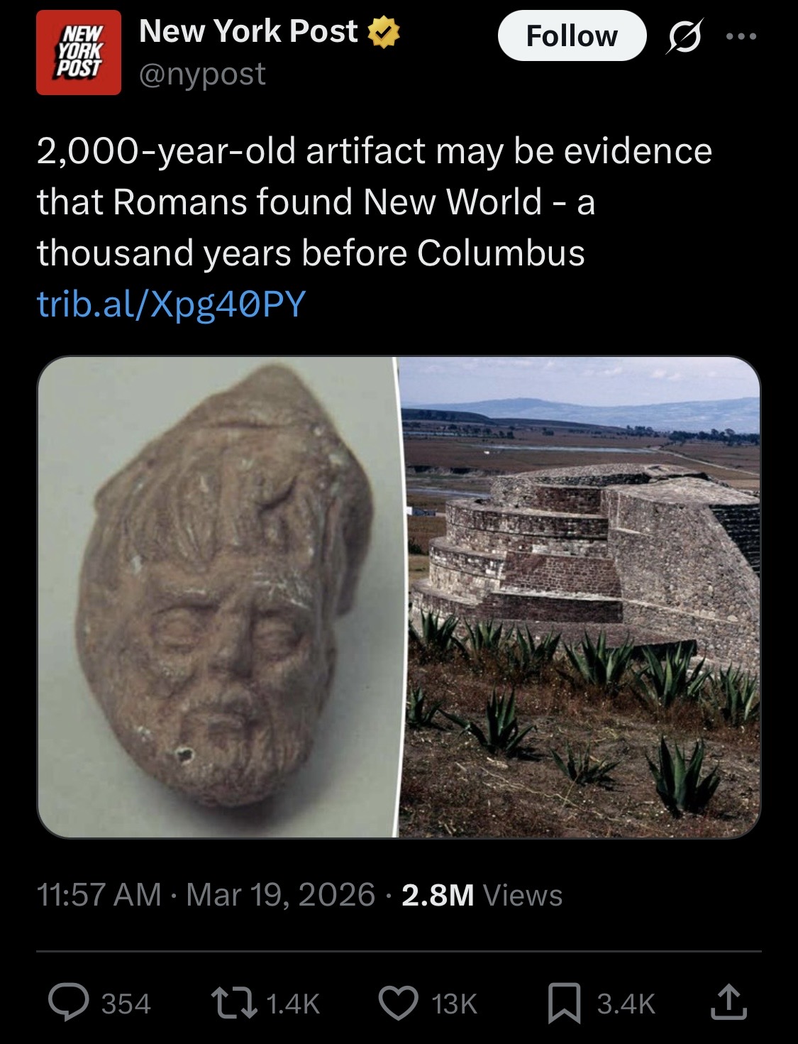 >>531229314Great article, but it's a nothing burger.Either a stray Roman or Greek ship caught in a storm off Europe's western coast, drifting straight over to Yucatán, just as the tradewinds go.Or, the artifact was on an early voyage such as that from Columbus, and traded with natives for gold. According to the timeline presented by the article, that would've given several decades for the artifact to have wound up buried in a tomb by 1510.Or, a "cheeky archaeologist" messing with the dig and planting an old Roman head there.Far, far more likely scenarios before you even get to the most remote chance that Romans actually settled in the new world before Columbus